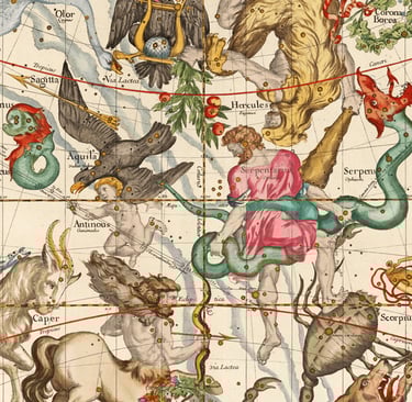 The story becomes interesting when astrology attributes as ruler of Ophiuchus the asteroid Chiron, representative of healing. Chiron was a centaur, son of Cronos (Saturn) and the nymph Philyra. He was a great sage and expert in medicine, a talent he received from Apollo. In turn, he taught this art to Asclepius and astronomy to Heracles (Hercules), who accidentally killed him with a poisoned arrow dipped in the blood of the Lernaean Hydra (a seven-headed dragon). The centaur suffered greatly until Zeus, moved by pity, transformed him into a constellation, Sagittarius.